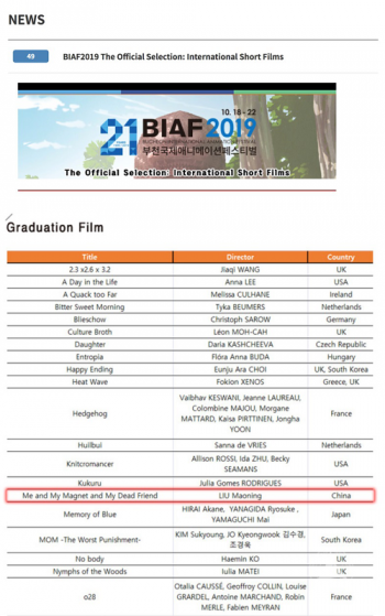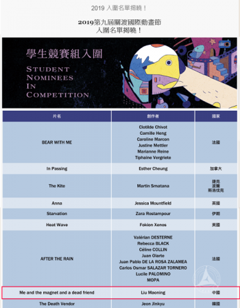 (通讯员 张若琦)继7月31日入围台中国际动画影展之后,8月,我校动画学子刘毛宁的作品《我和吸铁石和一个死去的朋友》在国际竞赛中再获战果,先后入围2019韩国富川国际动画节(Bucheon International Animation Festival)的毕业作品竞赛单元(Graduation Film Competition )以及2019台湾关渡国际动画节的学生竞赛单元(Student Nominees in Competition),同时也创造了短短一个月之内三度入围国际知名节展的喜人佳绩。