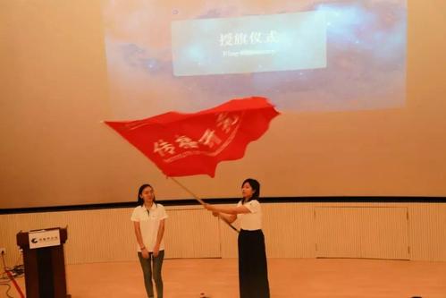 在象征薪火相传的授旗仪式上,传播研究院研究生会主席巩玉平同学为2019级新声代表王一淳同学授旗,这是精神和信念的传承,猎猎旗帜下,是一颗颗传媒学子火热的心在同频跳动。