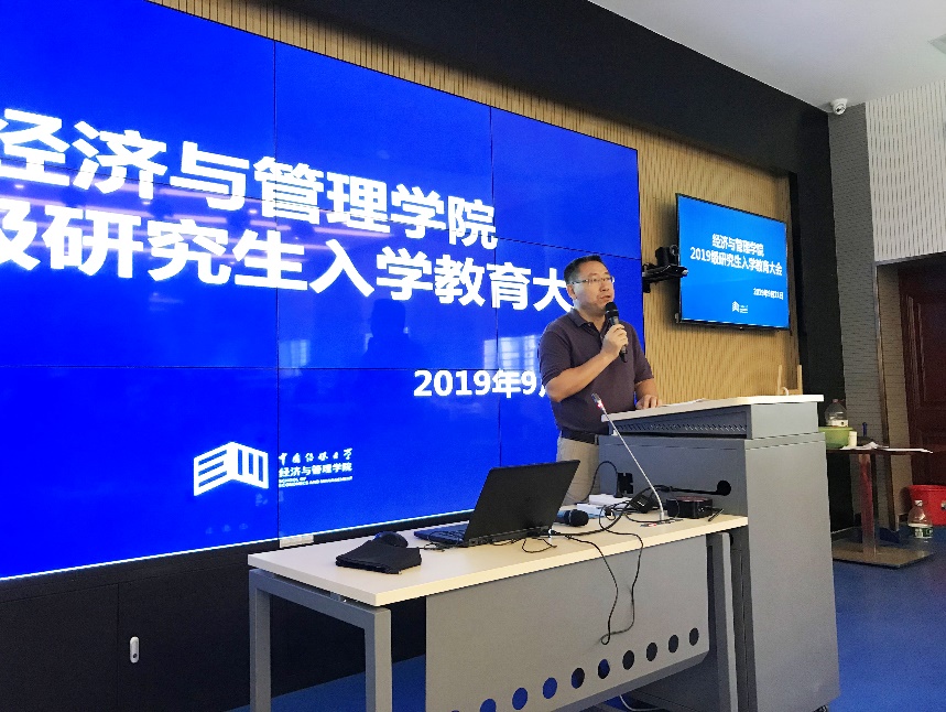(通讯员 蒋洁 张海珍 摄影 马瑞泽)初秋的北平,秋风送爽,硕果盈枝,又是一年迎新季,经济与管理学院又迎来一批青春激昂的莘莘学子。为了帮助新生尽快融入研究生的校园生活,2019年9月11日星期三上午9点,中国传媒大学经济与管理学院在33号楼一层报告厅举办了2019级研究生新生的入学教育大会。学院党委书记金雪涛、副书记毛建国、副院长李珍晖、学工办蒋洁老师、2011级MBA校友张弛、2018级老生骆蓓娟同学以及全体2019级研究生和博士新生参加了教育大会。会议由毛建国副书记主持。