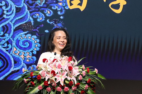 留学生代表,2019级汉语国际教育专业爱美丽(墨西哥)同学发言。她饱含激情地分享了自己学习汉语的历程:在中国那句老话“活到老,学到老”的鼓励下,爱美丽32岁开始学习汉语,今年41岁,达不惑之年的她又正式开启了自己在中国传媒大学人文学院(汉语国际教育中心)的求学之旅。“我叫爱美丽,我爱中国,我爱中国传媒大学,我爱人文学院,我爱汉语国际教育中心,我爱你们!”爱美丽同学言辞间充盈着新学期伊始的自豪和期待,相信汉语国际教育中心能给她带来充满收获的的学习体验。