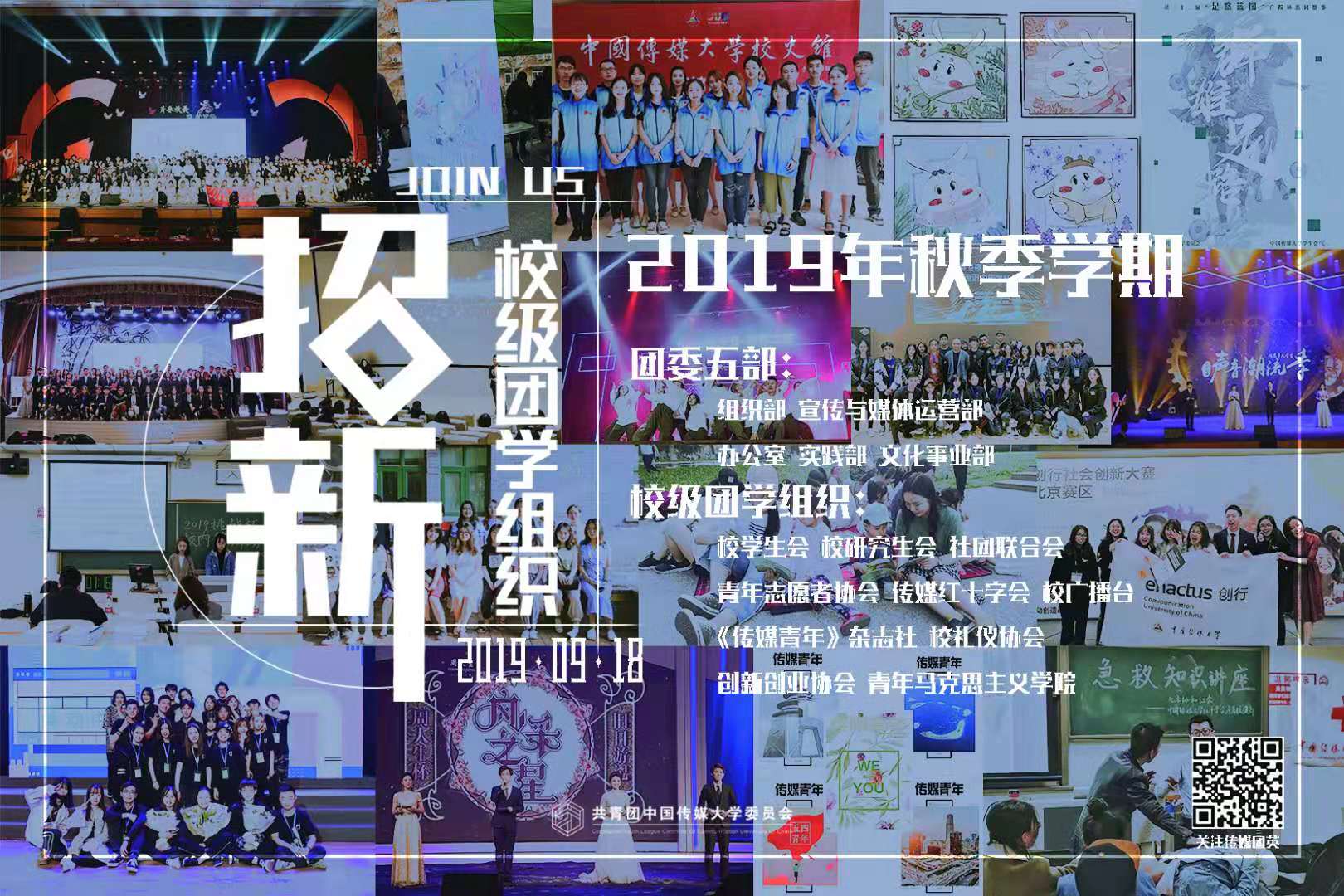 (通讯员 周书怡 李月彤 吴静 摄影 李世佳 陈浩冉)为了给2019级新生提供锻炼自我、展示自我、提升自我的平台,同时也为学生干部队伍充实优秀人才,确保各团学组织新学期工作的正常进行,9月18日,中国传媒大学校团委各团学组织招新宣传工作在钢琴湖畔顺利进行,并得到了2019级新生的积极响应。