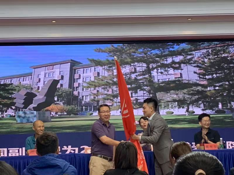之后,学院党委副书记毛建国为2019级MBA新生代表授院旗,鼓舞士气,宣布下午出发前往拓展训练基地。