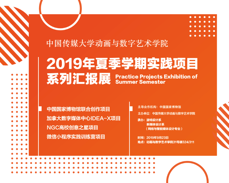 在7月初的夏季学期中,动画与数字艺术学院游戏设计系、新媒体设计系(网络与智能媒体设计专业)的同学们在专业老师的带领下,参与了中国国家博物馆联合创作、加拿大IDEA-X项目、NGC高校创意之星项目及微信小程序实践训练营项目,后续经过两个多月的紧张创作,最终在9月末呈现了一场独具特色、令人耳目一新的新媒体交互设计作品展。