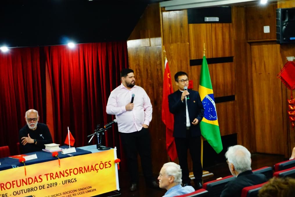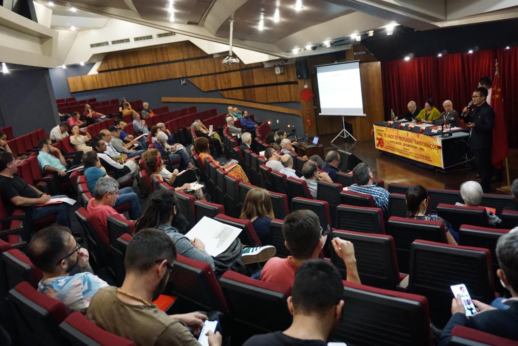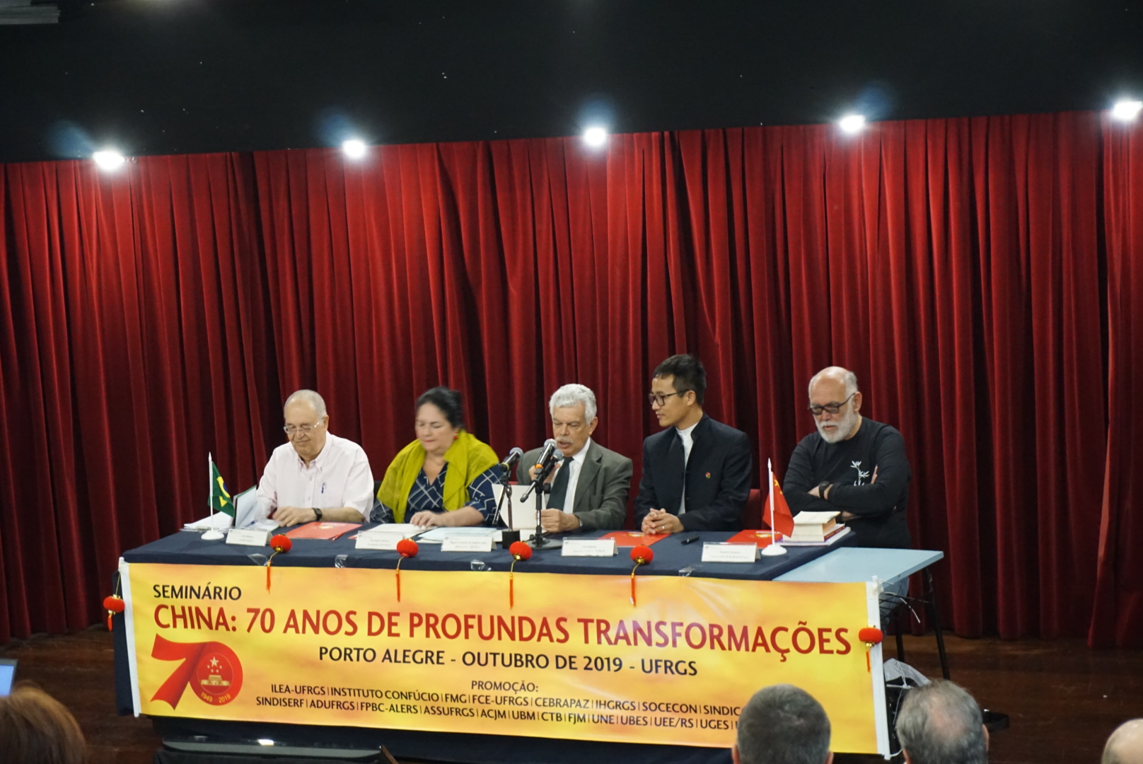 (通讯员 宋雪薇)当地时间2019年10月1日,正值国庆,巴西南大河联邦大学孔子学院应邀参加了由南大河州联邦大学拉丁美洲高级研究院举办的拉丁美洲高级研究院第十四届科学与人文科学高级研究圆桌会议。此次是拉美研究中心为“庆祝中华人民共和国成立70周年”专门组织的主题系列讲座活动,有七十余名大学师生及社会各界人士参加。南大河州联邦大学孔子学院巴方院长安东尼奥·多明戈·帕督拉教授、汉语教师柳志明和孔子学院巴方主任阿托斯先生及孔院学员代表出席,柳志明老师发表了主题演讲。