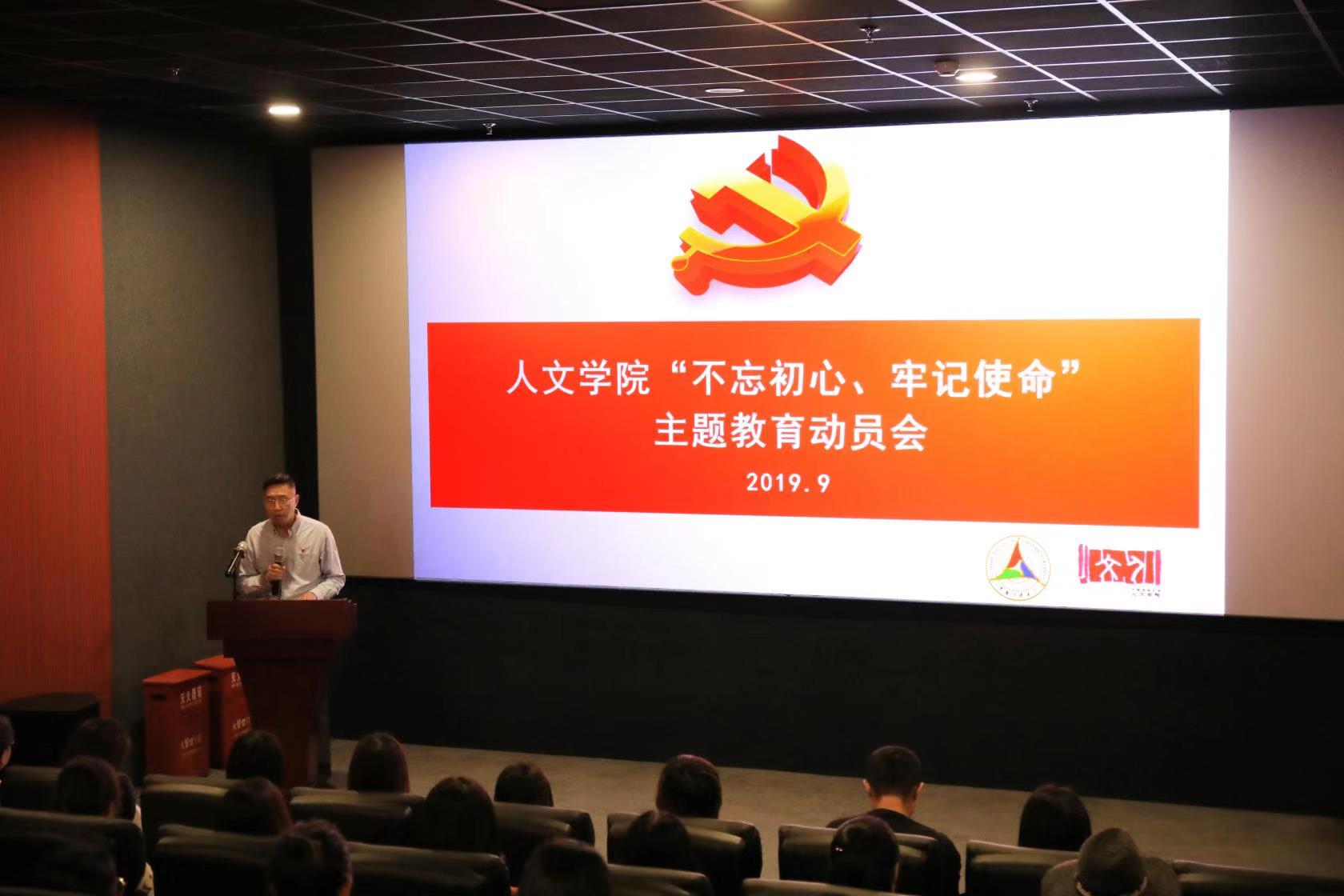 (通讯员 乐琦)9月25日下午,人文学院在新影联东申影院召开“不忘初心、牢记使命”主题教育动员会暨“我和我的祖国·电影党课”主题党日活动。人文学院党委书记李有兵,人文学院院长、党委副书记张晶,党委副书记刘首兵,教师党员代表及学生党员参加了本次活动。本次电影党课的主讲人为中共北京市委党史研究室研究处处长陈丽红,主题为“缅怀香山革命历史,继承发扬革命精神”,中共中央进驻香山的历史。