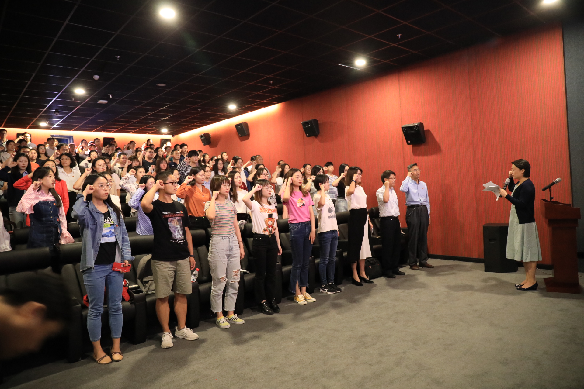本次活动共分为六项流程,分别是:一是集体奏唱国歌;二是学院党委书记李有兵致辞;三是学院院长、党委副书记张晶致辞;四是专家陈丽红讲解相关历史;五是集体重温入党宣誓词;六是观看电影《决胜时刻》。