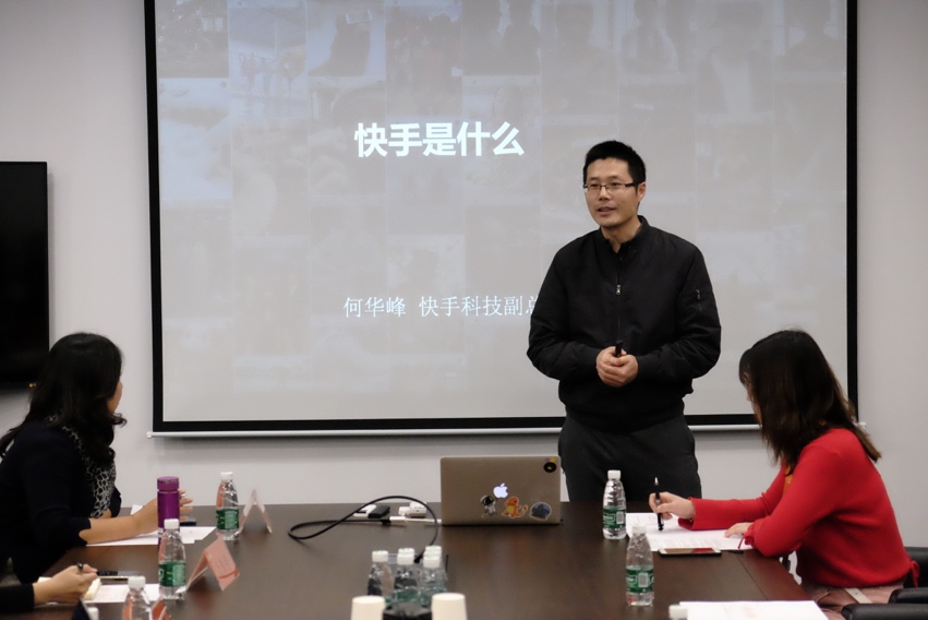 快手科技副总裁何华峰介绍了快手的基本情况,包括其发展历程、现状以及公司理念、运行机制等,特别是快手致力于为每一个普通人提供链接世界的机会,使很多贫困地区的人借助短视频和直播服务实现脱贫的案例。