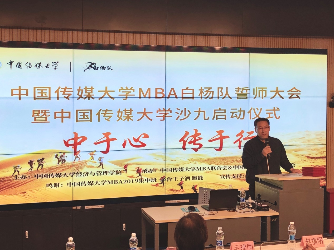 (通讯员 张利春 张艳芳)11月9日,中国传媒大学MBA白杨队第九届亚太地区商学院沙漠挑战赛誓师大会暨“沙九”启动仪式在我校33号楼一层多功能厅隆重举行。经济与管理学院党委副书记毛建国,亚沙赛组委会代表王莉、占风,马拉松协会会长赵福明,中国传媒大学MBA校友会会长张明君,各兄弟院校“沙九”代表队领队以及中传白杨队“沙九”的预备队员们出席了启动仪式。会议由中国传媒大学MBA联合会主席王鹏翔主持。
