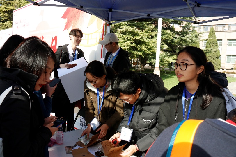 在校友服务发展中心志愿者的组织下,中传寻宝活动也在顺利地进行着。校友们手持“通关文牒”,分别在南门、体育场、孔子广场、图书馆和校友之家五个地点打卡,集齐五个邮戳将会有志愿者发放校庆专属纪念品一套。同时校友们也可以通过为母校折星星、千纸鹤的形式领取一套手绘四季版校友之家便利贴。现场的打卡地点很快排起了长队,志愿者们为校友派发明信片、盖章,以自己最真诚的方式,欢迎各位校友回家。