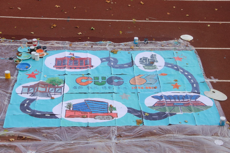 在体育场,广院设计师活动人气高涨。铺开的画布上印着五个校内地标——主楼、中传“大拇指”、体育场、大阅城以及校友之家。校友们为空白填上颜色,一笔一画勾勒出母校风韵。
