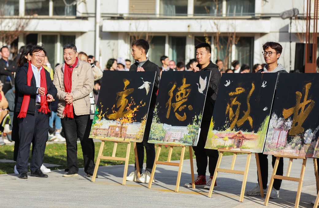 下午,在新落成的中传文化广场,校友和学院师生百余人深情合唱校歌《校园里有一排年轻的白杨》,抒发传承“忠诚、自信、包容、竞先”中传文化基因的爱校情怀,展现学院新时代立德树人的育人风范。学院院长屈善孝和特邀校友张步兵在合唱现场,以别具一格的艺术手法,共同制作学校校训“立德、敬业、博学、竞先”,重温育人使命,为母校庆生。