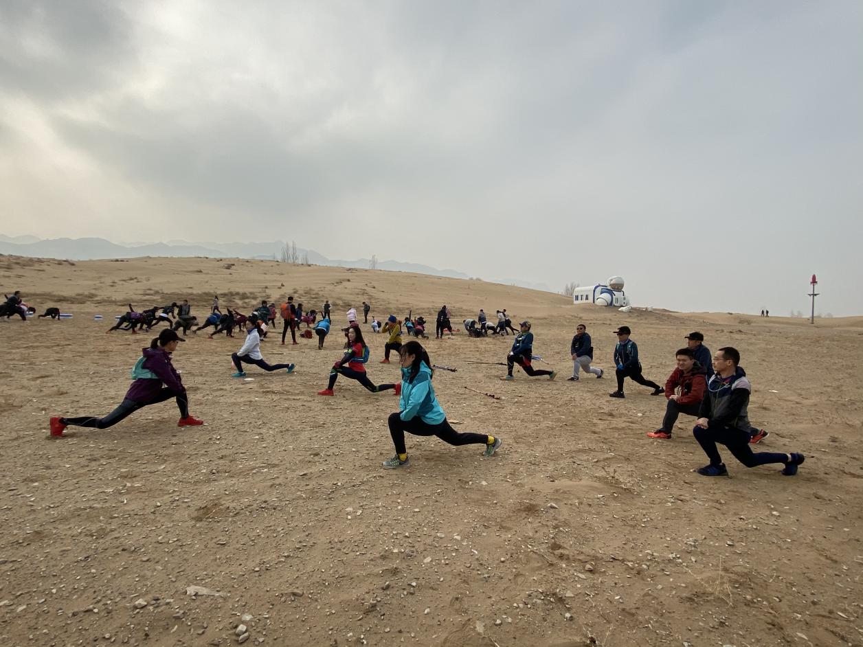 上午10:00,高校联队陆续到达怀来天漠并集合。中传MBA白杨队对此次拉练充满期待、信心十足,刚到沙漠便激动不已,跃跃欲试。待同学们整装集合完毕,队长张艳芳向大家详细介绍了沙漠的地形地势,并讲解了如何在起伏的沙丘地形上借势发力、缓解阻力。随后,她又介绍了越野鞋,越野包等装备的重要性,并一再强调大家应着重体验“沙跑”与“路跑”的体能区别。最后根据体能情况,队员们分组拉练,以强带弱,以期每个人都能发挥自己的最大潜能。分组完毕,教练带领大家进行了跑前热身。