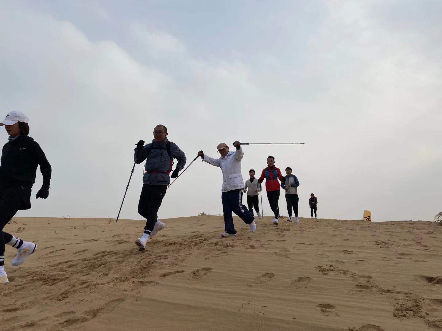 队员们的情绪在热身后更加高涨,随着开跑的鸣笛声响起,队员们纷纷冲向沙丘,开始了长达10公里的沙漠拉练。