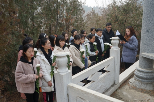 随后,马院研究生党支部一行人来到了艾官营村烈士纪念碑,缅怀革命先烈,告慰英灵。积极分子王莺飞主持悼念仪式。研究生党支部书记祁锦轩代表同学们在烈士纪念碑前发言,她谈到,“今年是新中国成立七十周年,为了我们今天的和平安宁,先烈们用自己的行动,写下了可歌可泣的光辉业绩;他们用自己的热血,浇灌着人民的幸福之花;他们用自己的宝贵生命,铺就了通往胜利的革命道路。今天我们来到这里,就是为了探寻初心,牢记为实现中华民族伟大复兴的中国梦而不懈奋斗的神圣使命。”同学们向烈士纪念碑致敬并为烈士们献花,一朵朵白菊花寄托着同学们的哀思,也承载了同学们学习英烈、恪守对党和人民作出的庄严承诺。