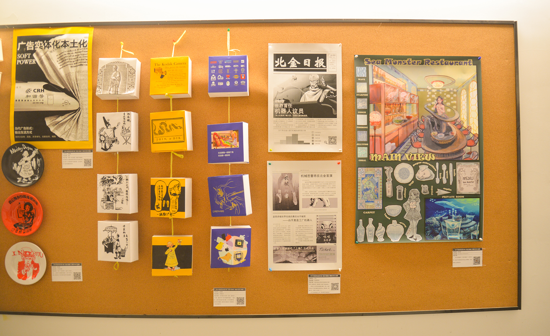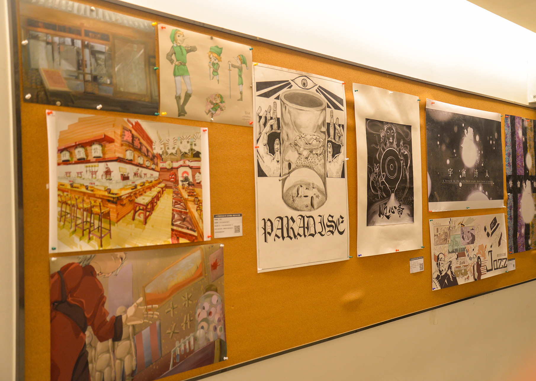 为了更好地展示该课程的作业和相关研究,二楼集中陈列的是结课设计创作。由同学们每人自选创作主题,经过深入研究和绘制表现,形成一个以主视觉加上若干延展创作的系统化形式。同学们的创作主题有:中西广告元素对比、赛博朋克和中国未来、中西方古壁画交融长卷(敦煌主题)、给未知星球带去人类文明等等。