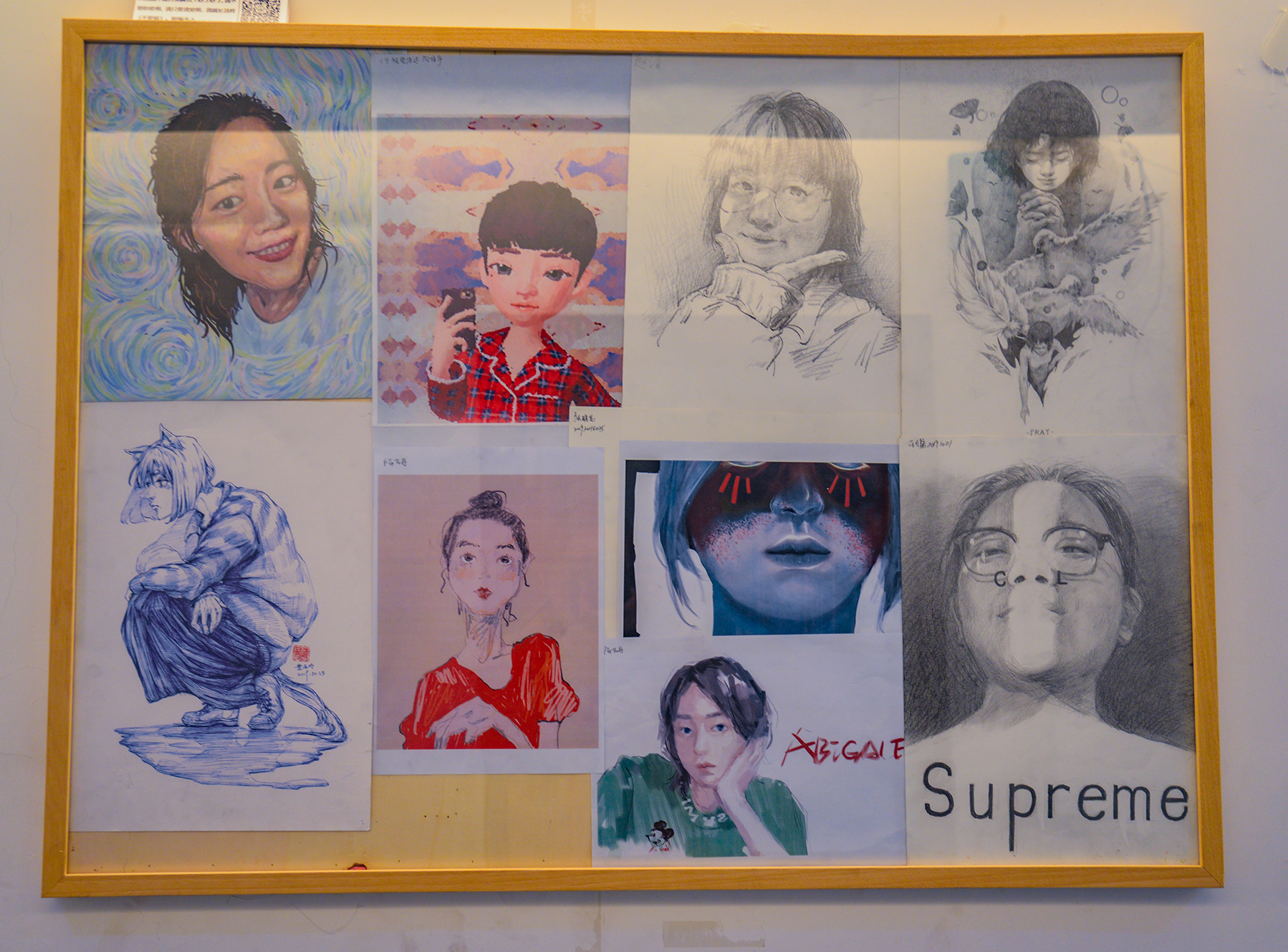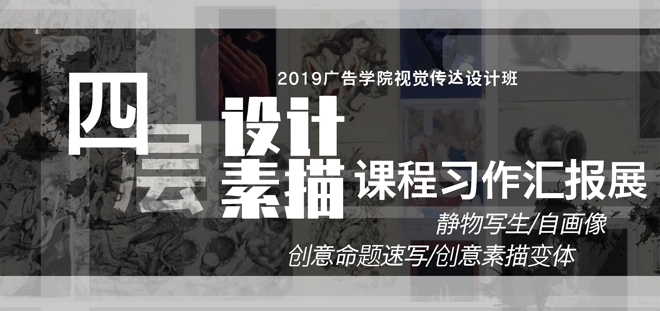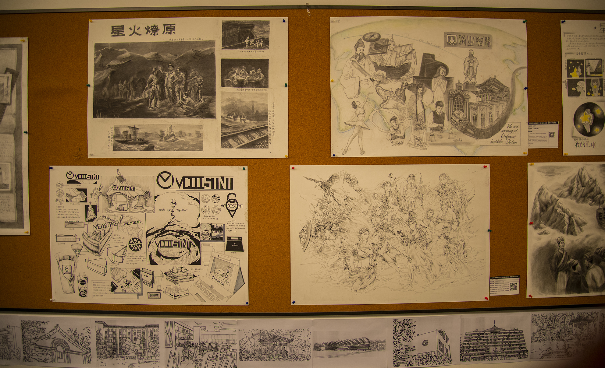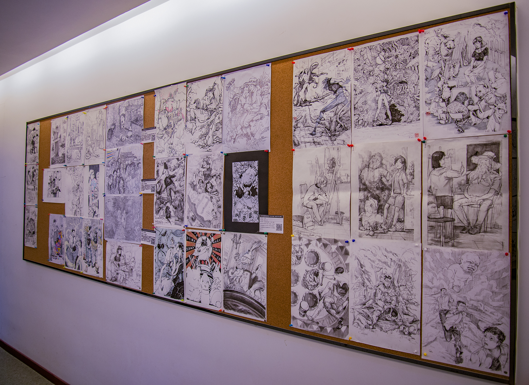 四楼为创意命题速写和创意素描变体的小作业展示。其作为传统素描和创新设计的衔接被安排为课后作业,意在拓宽学生的设计思路。16开创意素描变体小作业创意无限,同学们的8开素描自画像惟妙惟肖,生动有趣。