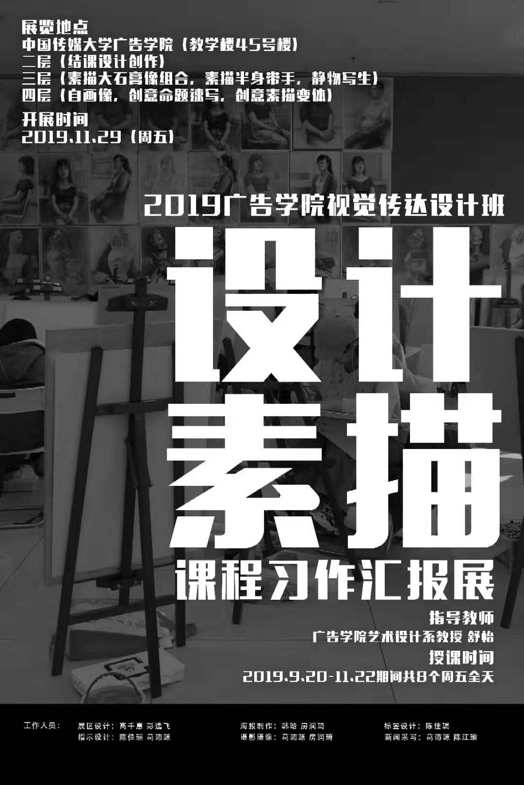 (通讯员 陈江瑜 葛沛源)2019年11月29日,艺术设计系19级视觉传达设计班“设计素描—课程习作汇报展”在系主任肖虎教授的指导和推动下,于中国传媒大学45号楼广告学院内正式开展。该展览位于二、三、四层走廊,分别展示了2019级新生的结课设计创作、素描写生、创意命题速写等作品,体现了同学们扎实的基本功和良好的创意思维。