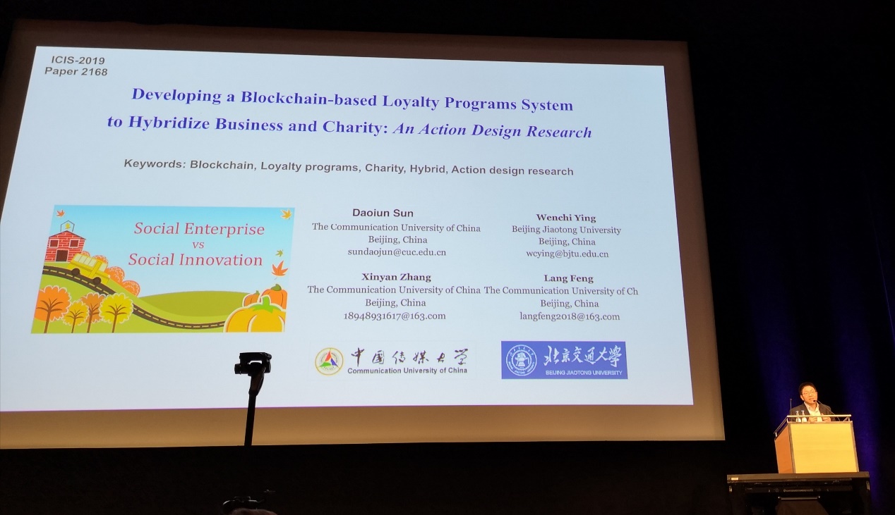 (通讯员 孙道军)由国际信息系统协会(AIS)主办的2019年国际信息系统会议(ICIS2019)于2019年12月15-18日在德国慕尼黑召开,我校经管学院教师孙道军作为学术论文“Developing a Blockchain-based Loyalty Programs System to Hybridize Business and Charity: An Action Design Research”的第一作者,接受会议邀请并在会上作本论文的主题报告。
