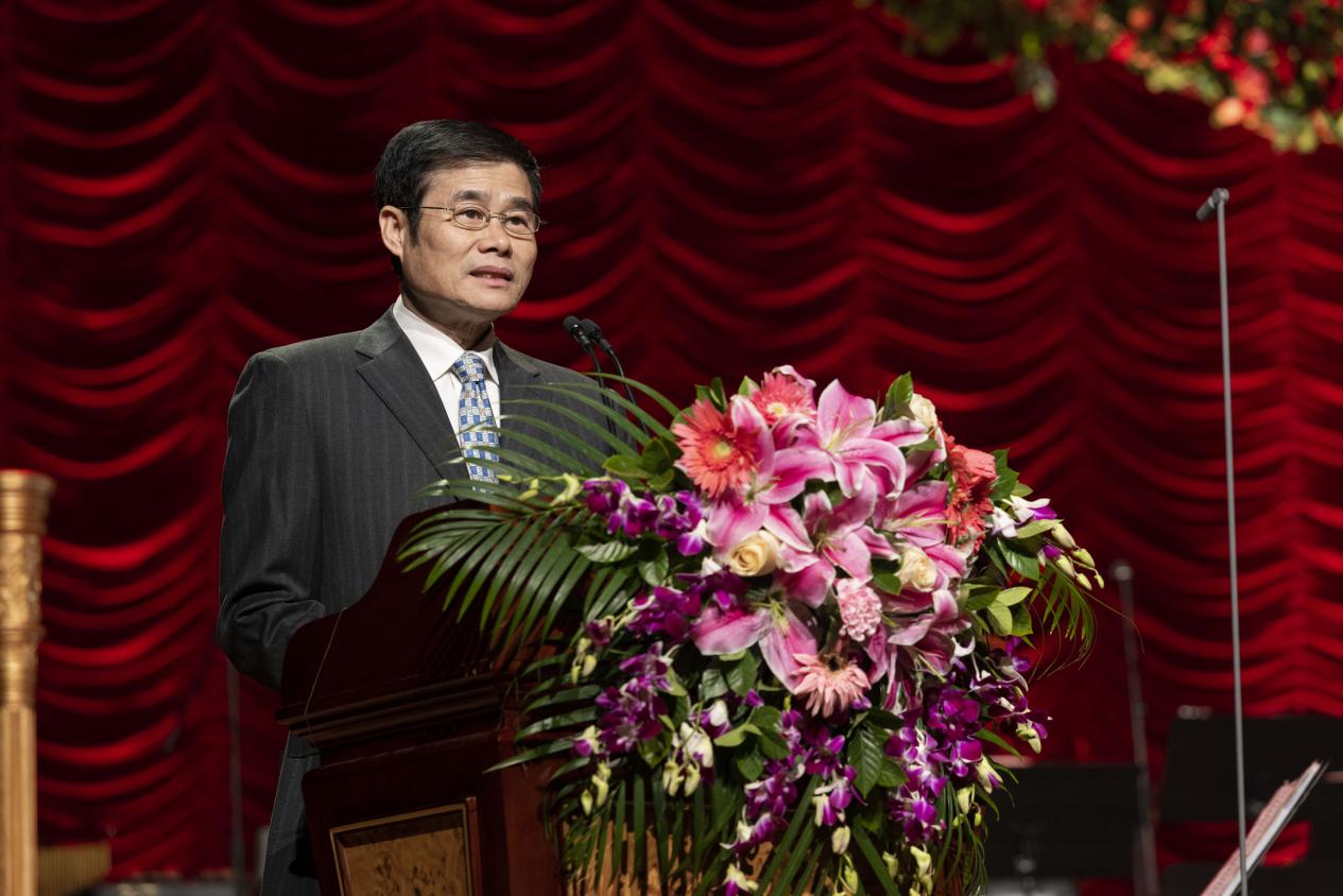 在音乐会正式开始之前,陈文申书记首先作新年致辞。他带领大家回顾了我校2019年取得的丰硕成果,并对全校师生致以诚挚的新年问候与祝福。致辞后,陈文申书记、廖祥忠校长共同为在新中国成立70周年庆祝活动中,参与广场合唱、音频保障服务的师生代表颁发了先进集体奖和个人奖。音频保障团队获得北京市庆祝活动领导小组音响保障指挥部荣誉表彰,广场合唱队伍获得“北京市筹备和服务保障中华人民共和国成立70周年庆祝活动先进集体”嘉奖。