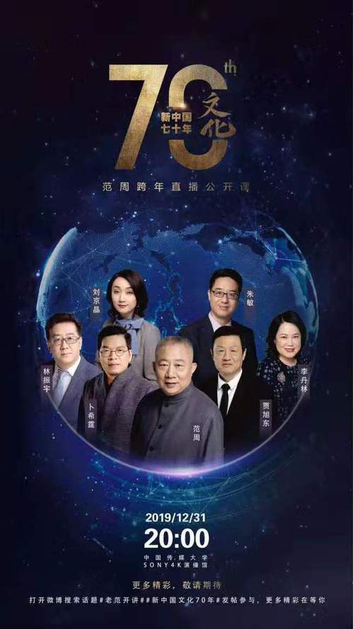 2019年12月31日20:00——2020年1月1日00:15,由中国文化产业协会指导,中国传媒大学主办,中国传媒大学文化产业管理学院、中国传媒大学电视台、北京电视台科教频道承办的“新中国文化七十年”2019年跨年直播公开课将在中国传媒大学4K演播厅举行。本次跨年直播公开课由国内知名文化学者、中国传媒大学文化产业管理学院范周教授领衔主讲,联合卜希霆、贾旭东、李丹林、朱敏、刘京晶、林振宇等六名专职老师组成学术讲师团共同登台,回顾和展示新中国成立70年(1949—2019)以来文化发展与建设历程,追忆新中国文化发展70年全过程。
