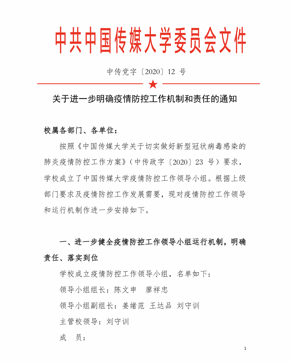 疫情爆发正值假期,绝大部分师生员工回家过春节,针对师生分散在全国各地实际,学校通过多种方式,教育引导师生严格遵守并执行当地防控管理规定和要求,积极做好防护,保障自身和他人安全。党委教师工作部发布《致全体教职工的一封信》,在问候教职员工的同时,对做好疫情防控提出要求;学生工作处发出《虽隔千里,相守相望——致全体中传同学的一封信》,要求学生防控疫情做到“四个爱”:爱自己、爱家人、爱他人、爱社会,做到居家不外出,多读书,勤思考。各学院按照学校要求,积极为学生提供阅读书目,提供学习指导,辅导员、班主任通过各种方式与学生保持紧密沟通,实现“点对点”、“一人一案”,确保全员覆盖。教务处根据延期开学实际,积极制定预案,调整教学安排,组织录制教学课程,开展线上教学;图书馆开通了远程访问平台,供师生在家利用馆藏资源学习等等。