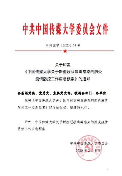 (记者 宋佳音)为贯彻落实北京市、教育部新型冠状病毒感染的肺炎疫情防控工作要求,针对当前疫情发展情况及我校工作实际, 学校出台了《中国传媒大学关于新型冠状病毒感染的肺炎疫情防控工作应急预案》(以下简称《预案》),科学制定、全面落实各项防控措施,为全校积极应对和正确处置疫情提供了详细的、可操作性的工作方案。