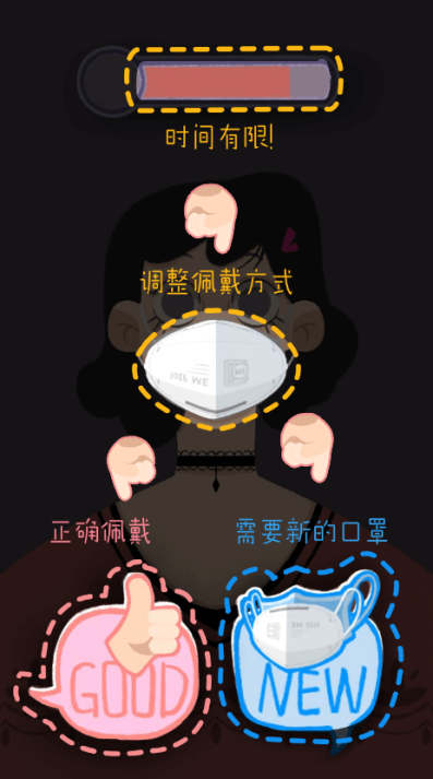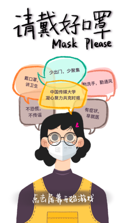 《请戴好口罩》微信小游戏由动画与数字艺术学院19级互动艺术与技术研究生孙艺源、18级游戏制作研究生刘大可共同设计完成,在防控的特殊时期,通过小游戏让玩家掌握更全面的口罩佩戴相关知识。