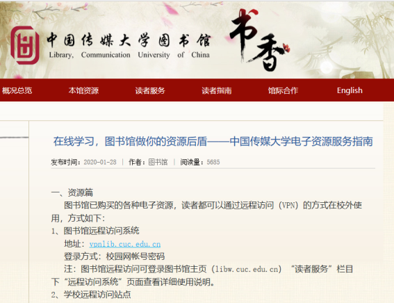 图书馆在主页发布了电子资源远程使用方法和《中国传媒大学已购电子资源说明》,帮助师生正确使用远程电子资源,并通过“中传大阅城”微信公众号推出了3期电子资源信息,引导师生通过远程方式使用图书馆电子资源。