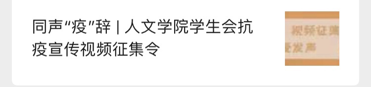 (通讯员 乐琦)近日,人文学院积极响应学校统一部署,人文学院学生会面向学校全体同学(含在读生、已毕业校友)开展“同声‘疫’辞|人文学院学生会抗疫宣传视频征集令”抗疫宣传视频征集活动,号召大家通过拍摄制作视频,将祝福和温暖送给一线的医护人员、为中国和湖北呐喊加油,鼓励大家通过视频普及科普防疫知识。人文学院将在官方微信公众号和人文学院网站开辟专栏,刊登征集到的视频作品。