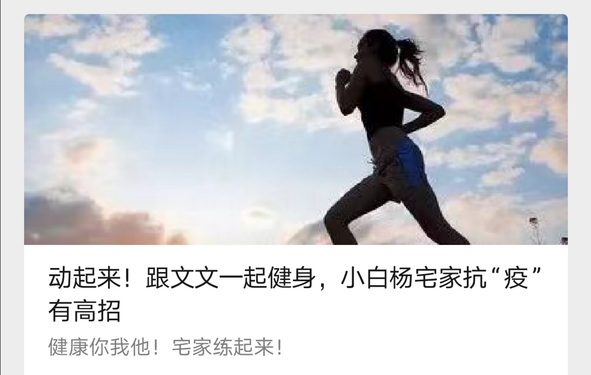 针对师生居家防疫的实际情况,人文学院在官方微信号上发布相关推送,详细地介绍了一些室内锻炼项目,为师生进行室内锻炼提供指导;同时,辅导员老师们也利用班级群等线上交流工具,积极向学生推荐关于室内锻炼的文章、视频、图片等,号召同学们科学锻炼、强身健体,增强了同学们的体育锻炼意识;此外,人文学院学生会等团学组织也积极做出响应,利用拍摄锻炼视频等方式,号召大家行动起来,合理健身、科学防疫。