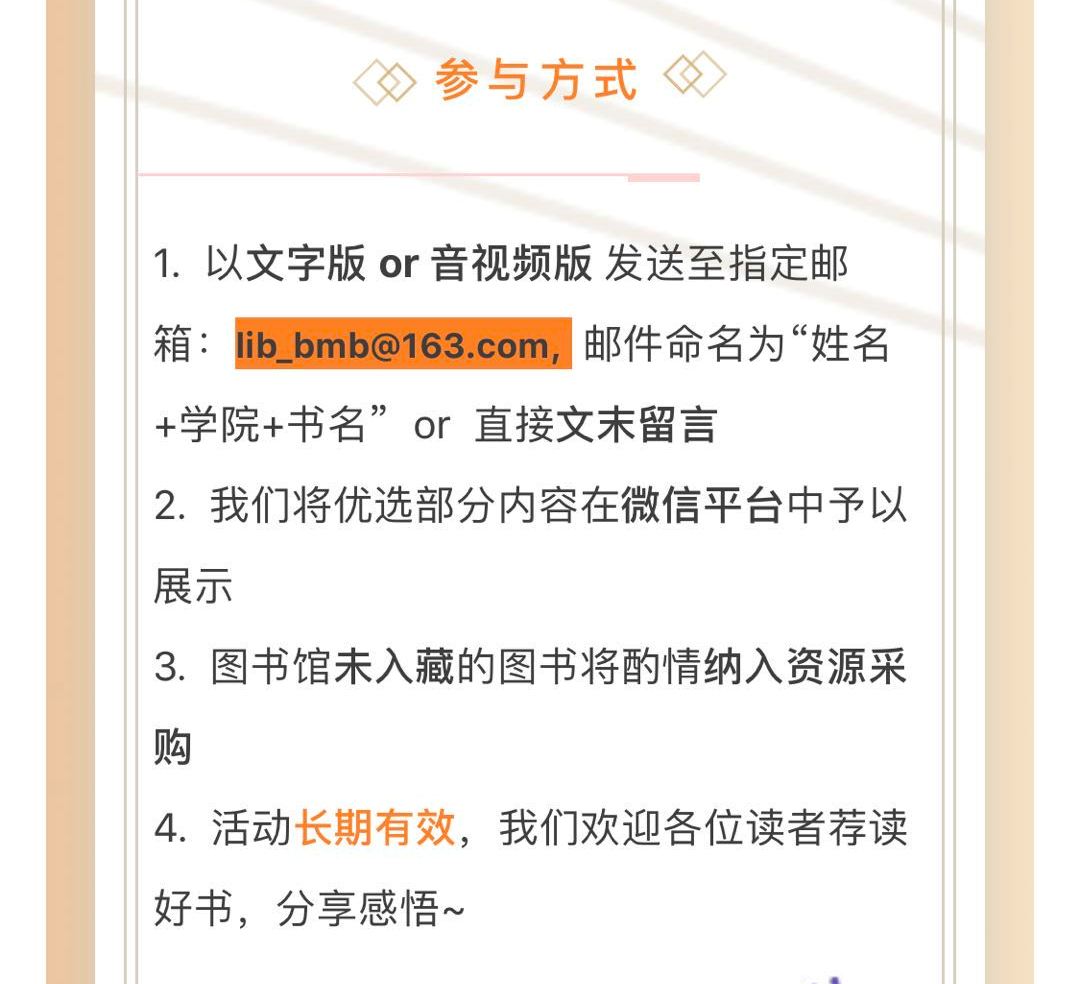 师生精彩荐读内容将通过“中传大阅城”微信公众号进行推送展示,推荐的图书目前未入馆藏的,图书馆将酌情纳入资源采购计划。