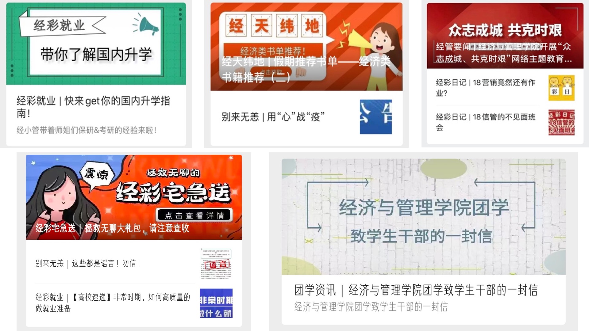 活动分为五大板块:“经天纬地” —— 整理并发布经管学院推荐的经济类、工商管理类、管理科学与工程类书单,号召学生通过组建学习小组、提交读书笔记等方式持续提升自己的学习能力与专业素养;“经彩日记” —— 以“众志成城、共克时艰”为主题,面向全体学生征集网络作品;“经彩就业” —— 延续上学期的就业创业相关线上教育,推出就业指导相关推送以及毕业生群体访谈,涵盖保研、考研、就业、项目就业、出国、英语四六级等方面,解答应届毕业生就业与在校生职业规划的各种疑问;“别来无恙” —— 学院在防疫期间转载或发布学校相关通知、健康提示以及思政教育等内容,为学生提供防疫贴士;“解忧杂货铺” —— 学生在假期及延期开学期间有任何学习或生活问题,均可通过投稿的方式进行反馈,学院给予最大程度的帮助和支持。