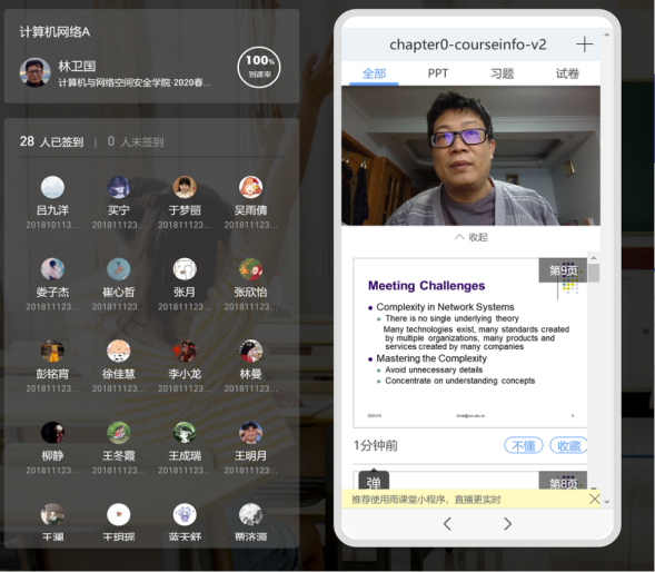 早上7时许,各学院老师们早早到达“云上教室”,在雨课堂、畅课、腾讯会议等平台进行最后的调试和准备,8点整,同学们准时抵达“教室”,课程顺利开讲。从当日各平台课程运行情况看,学生到课率、在线活跃度均较高,在线教学组织有序。