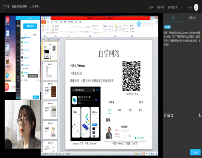 初次大规模线上教学,老师和同学们对此均表示了支持与认可,同时也表达了自己的真实感受和建议。外国语言文化学院颜巧容老师指出,适应新的教学模式和新的教学管理系统也带来了很多挑战,比如平台功能繁多复杂、学生在网络平台充分表达需要个性化及时反馈、网络不稳定打乱教学节奏等。在线教学不是把线下教学硬搬到线上,而是对知识构建方式、师生互动、教学流程设计的重新定义和构建。无论什么平台都是辅助教学的工具,最核心还是明确教学目标,做好教学设计,让平台为教学服务。播音主持艺术学院高原老师则认为,线上授课牵涉到授课环境、组织教学、对象感等诸多变化,相较于技术方面的问题,教师自身的调适更加重要,而且不只是授课内容、程序、时长和结构的重新设计,还牵涉到教师的心理、习惯等方面的预设和调整,甚至具体到语言表达习惯的改变,如何进行最优化设计和调整需要认真细致的思考和研究。