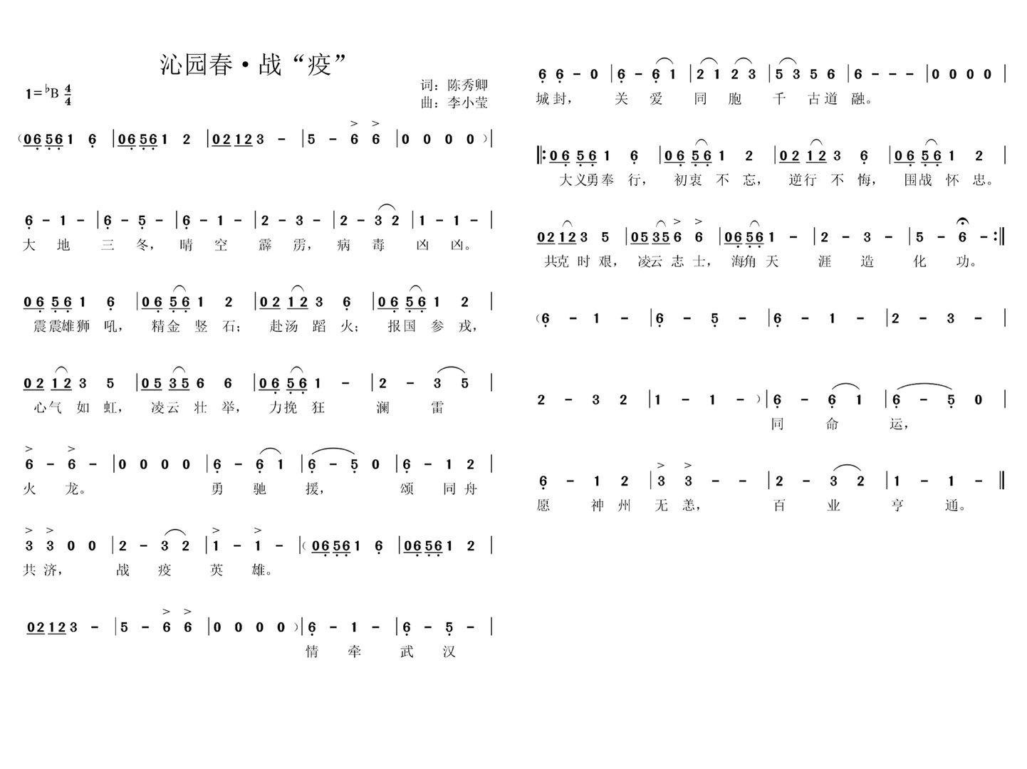 歌曲歌词创作采用《沁园春》词牌,表达万众一心战胜疫情的坚定信念。旋律创作运用了中国传统作曲“鱼咬尾”的手法,层层递进抒情达意。该视频在学校官方微信平台推出后获得广泛好评。