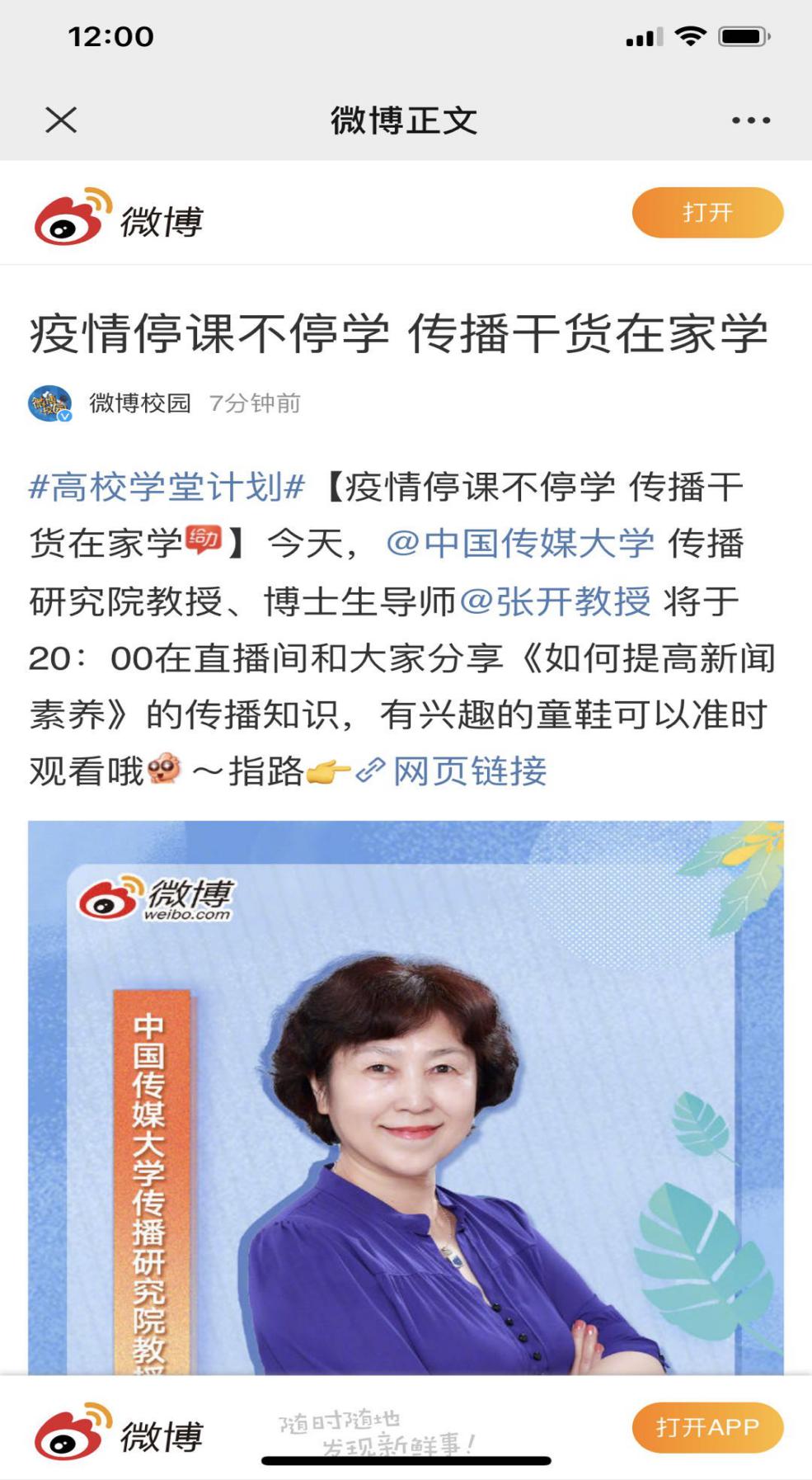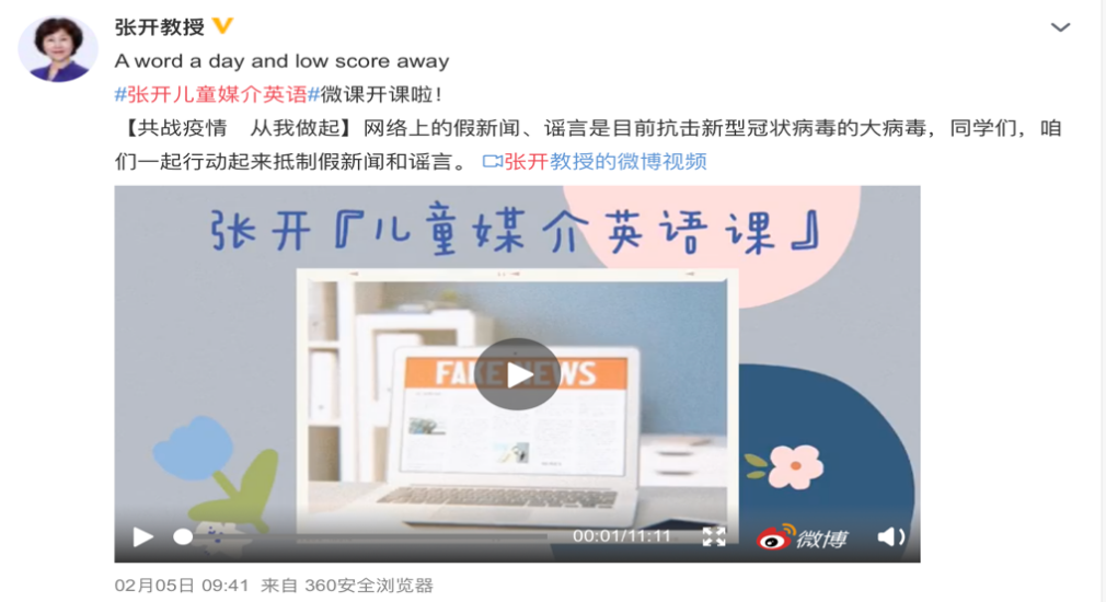 张开教授主持的“张开儿童媒介英语”课程成为微博热门课程。该课程是微博校园联合百所名校及高校名师共同发起的“高校学堂计划”的核心课程,立足于在轻松氛围中将媒介认知、传播能力、和学习能力融合到英语语言的学习和运用中,从而激发学生的学习兴趣、责任意识、交流能力和媒介使用的自我管理能力。该课程于2020年2月5日开课,第一课由“共战疫情 由我做起”开端,以fake news引入,呼吁以行动抵制疫情期间的假新闻和谣言。截至到3月20日,该课程的阅读次数达到292.9万。
