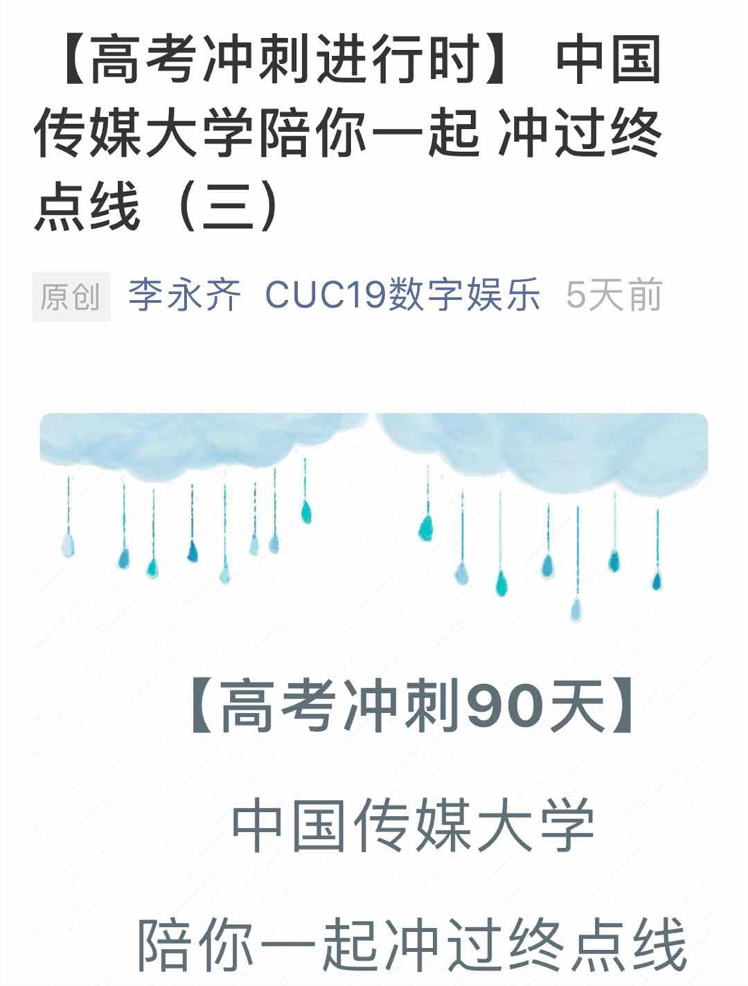 (通讯员 周天航)距离高考不到90天,我校动画与数字艺术学院2019级艺术与科技(数字娱乐方向)专业李永齐同学在“CUC19数字娱乐”公众号上推出“高考冲刺90天”系列文章,为备战高考的学子们加油鼓劲。