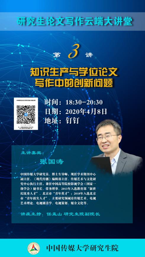 (通讯员 周思涵)“中传研究生论文写作云端大讲堂”第三讲于4月8日18:30准时开讲,主题为《知识生产与学位论文写作中的创新问题》,主讲嘉宾为中国传媒大学研究员、博士生导师,现任学术期刊中心副主任、《现代传播》编辑部主任张国涛。讲座由研究生院副院长任孟山教授主持。