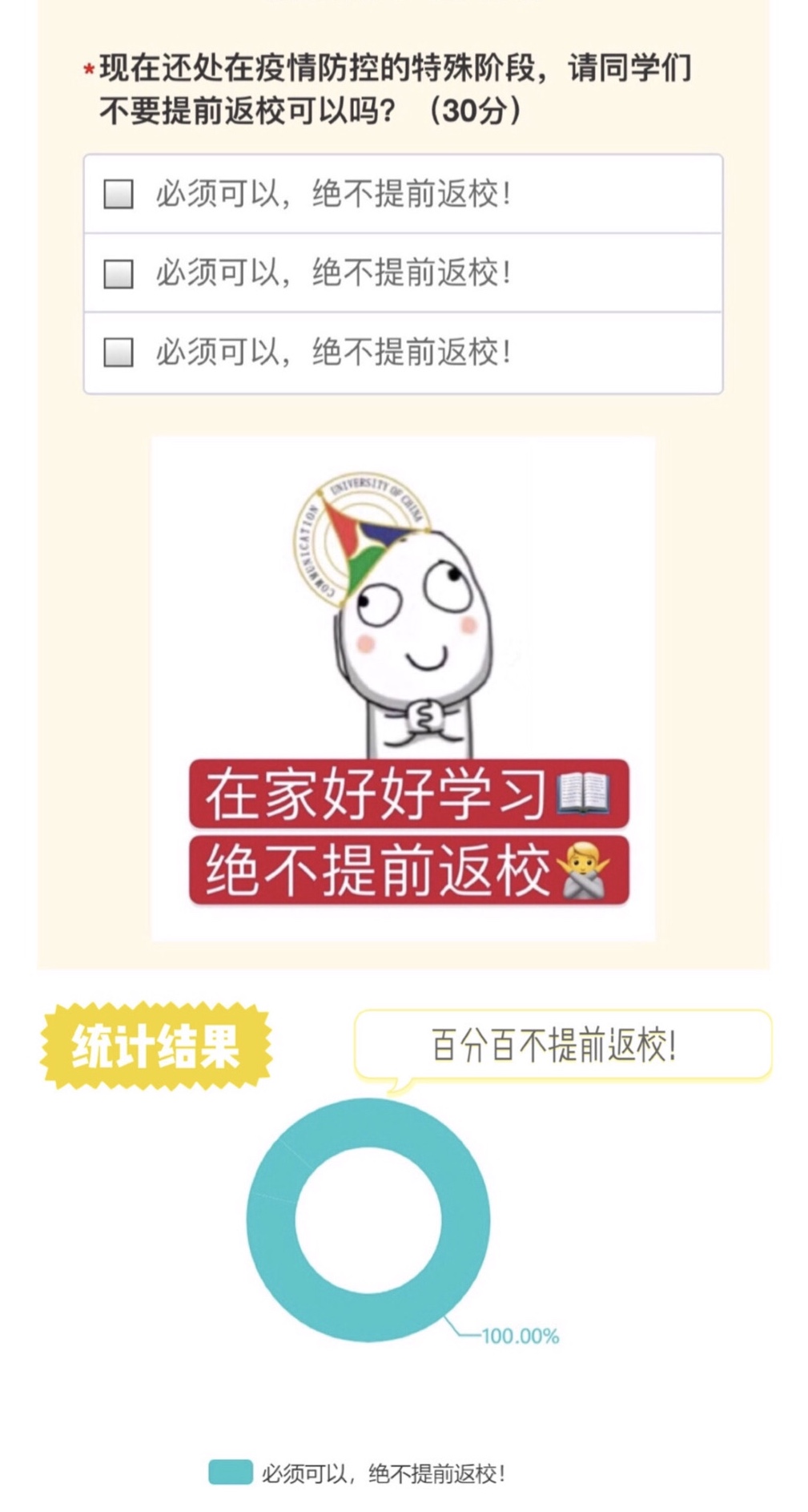 音录“云”调查,详细摸底学生情况,切实关注学生需求。活动通过小问答形式对学生“云”开学期间的学习适应、家庭关系、心理状态以及毕业生就业情况进行了解,穿插专业知识问答、疫情知识检测、学校“不离家、不返京”规定考题等内容,让学生更易于接受并体会到学院的关心关怀。通过此次调查,学院对同学们“云”开学期间的情况有了更为详细的了解,辅导员、班主任老师将根据调查反馈的信息,与学生加强沟通联系,关心关注学生,为学生提供必要的帮助和支持。