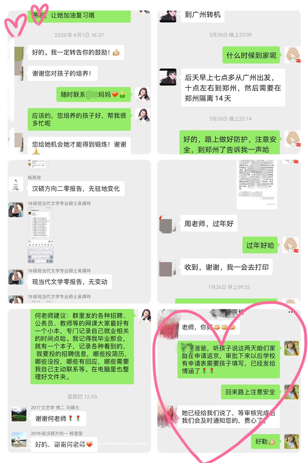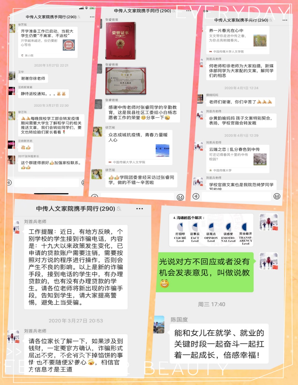 目前,人文学院已建立“家院携手同行”微信工作群,在群里广泛开展“云分享”活动。老师向家长分享学校、学院最新通知文件、学院工作情况、学生动态,家长也在群里分享了孩子居家学习生活的的点点滴滴。“云分享”拉近了学院和学生家庭的距离,增进了感情。家长们纷纷表示,感谢学院对孩子们的用心关爱。他们珍惜这段特殊时光,陪伴学生顺利、平安、健康地度过非常时期。