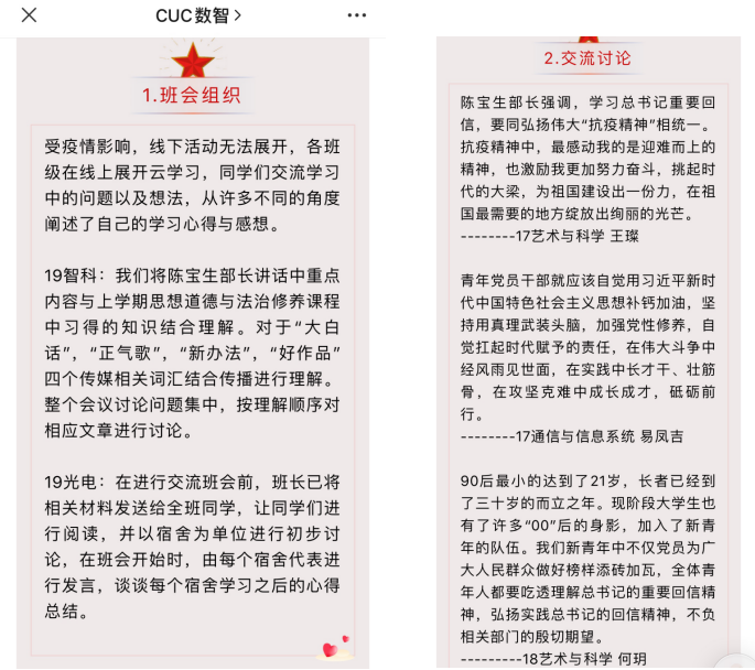 各班级认真学习视频文件资料,并且进行了交流讨论。疫情防控期间,学院各班级线上开展“云”学习,同学们从不同的角度阐述了自己的学习心得与感想。
