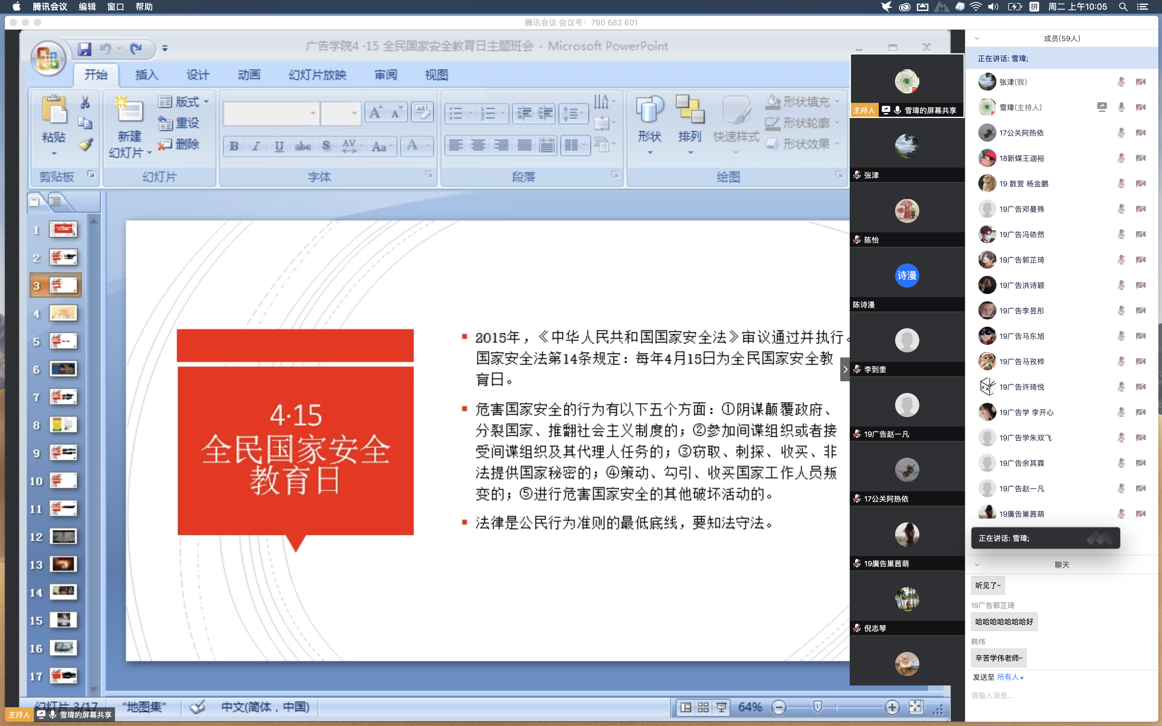 4月14日,广告学院辅导员张学伟老师通过在线平台与同学们进行了国家安全教育日的专题交流。张老师从国家安全教育日的内涵和意义讲起,结合案例和视频材料深入浅出地分析了国家安全与在校大学生及其专业学习的关系,特别是技术助推下的复杂传媒环境提升了国家的安全风险,突发性和隐蔽性成为新时期国家安全案件的新特征。