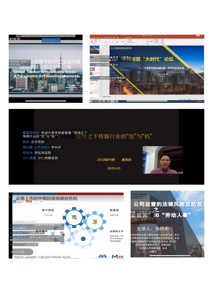 (通讯员 蒋洁)为认真贯彻落实中国传媒大学应对新冠疫情工作的各项部署,经济与管理学院本着“停课不停学”的原则,整合领域高端校友资源,利用线上直播平台自2020年3月19日起至4月20日每周四晚上为在校生和校友举办经管学院“大时代”论坛线上系列讲座,帮助同学们及时了解疫情带来的各种社会经济影响,充实大家在这一段特殊时期的学习时光。五期讲座由经管学院2019级MBA公宣迪同学主持,共吸引在校生和校友约800人参加。