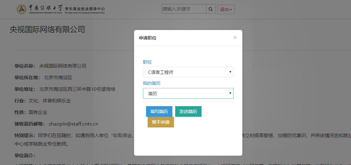 (通讯员 王雨晨 刘冰钰)为进一步应对新冠肺炎疫情,做好学院2020届毕业生就业创业工作,中国传媒大学2020届毕业生“鹏程万理——理工类专场”春季网络双选会,于4月20日至4月22日连续三天线上举办。本次双选会由学生工作部(处)指导,信息与通信工程学院、计算机与网络空间安全学院、数据科学与智能媒体学院、协同创新中心联合主办。