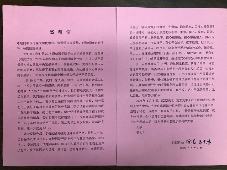 作为当时身处疫情中心的武汉籍学生家长,涂宇皓同学的父母深深感谢中国传媒大学对学生的关爱。在武汉解除封城以后,他们立即联系商家制作了锦旗,并写了一封感谢信寄到学校。