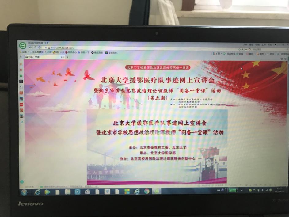 (通讯员 孙靖)为进一步深入学习习近平总书记给北京大学援鄂医疗队全体“90后”党员的回信精神,推动首都高校师生援鄂抗疫先进事迹融入思政课教学,4月29日下午,由北京市委教育工委、北京大学主办,北京大学医学部承办,北京高校思想政治理论课高精尖创新中心协办的北京大学援鄂医疗队事迹网上宣讲会暨北京市学校思想政治理论课教师“同备一堂课”活动(第五期)通过网络直播形式举办。我校马克思主义学院全体思政课教师在线收看学习,马克思主义学院近三年北京市“双百奖学金”获奖学生作为思政课教师后备人才参加了线上学习。