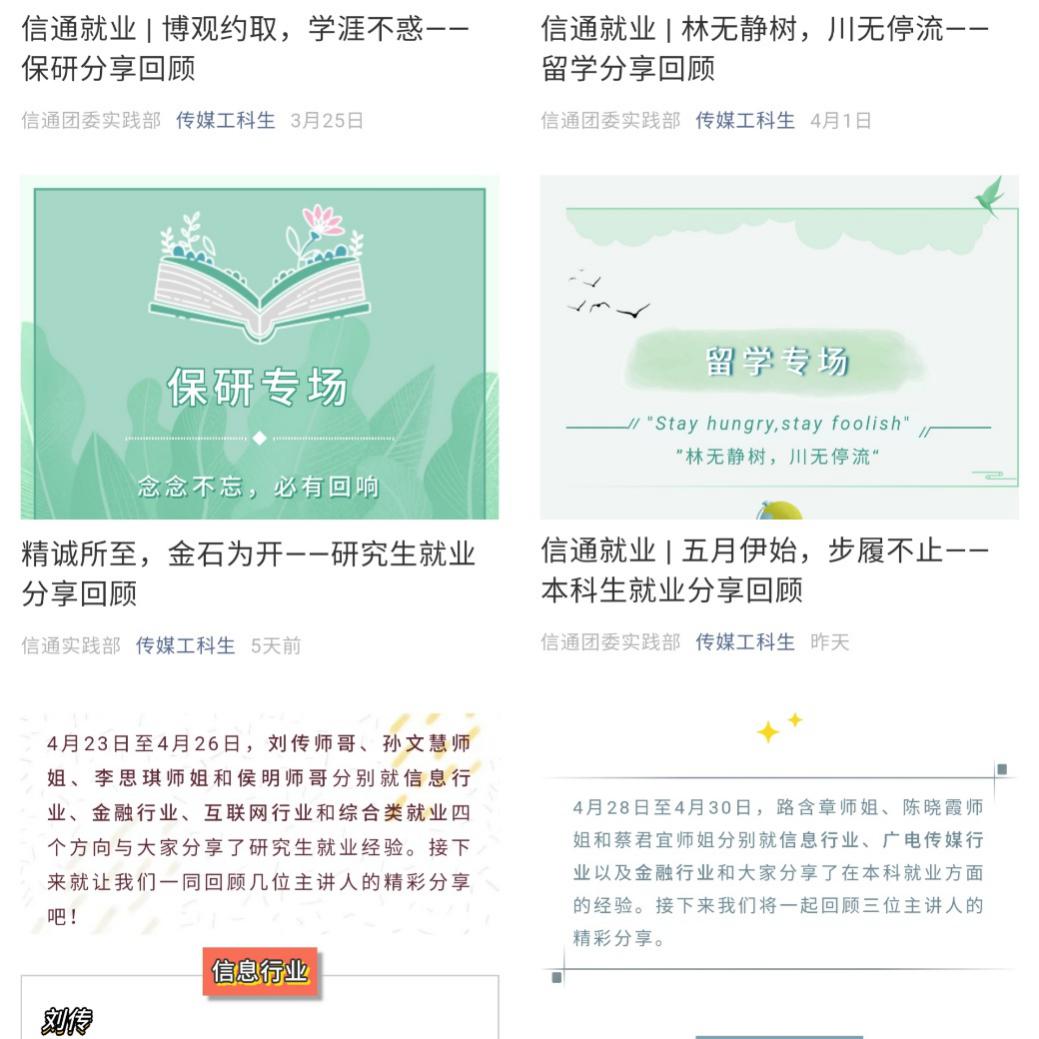 研究生就业专场共四期,刘传、孙文慧、李思琪和侯明四位研究生毕业生分别就信息、金融、互联网和综合就业四个行业,围绕网申、笔试、面试等求职的具体流程,讨论当下就业形势,疏导求职心态,通过分享自身成功经验给出相关建议。本科生就业专场共三期,路含章、陈晓霞和蔡君宜三位本科毕业生针对不同行业分享了自己的求职经历。