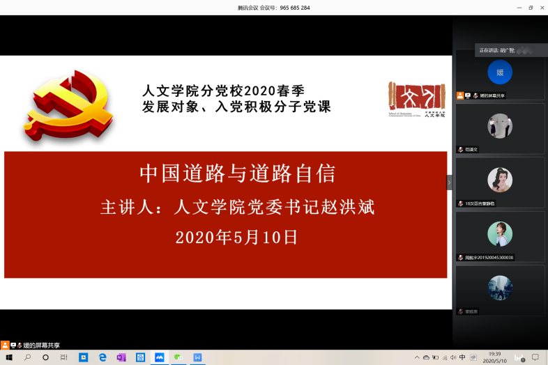 5月10日晚,人文学院党委以 “中国道路与道路自信”为题,举办线上专题党课培训。此次专题党课由人文学院党委书记赵洪斌教授主讲,学院党委副书记刘首兵、学生党务指导教师周媛媛、学院各学生党支部书记、全体发展对象、入党积极分子参加了此次专题学习。