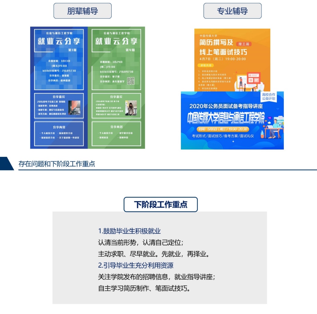 信息与通信工程学院将按照学校要求继续深入推进2020届毕业生就业创业工作,争取实现“两保障”和“两引导”,帮助2020届毕业生充分、满意就业。