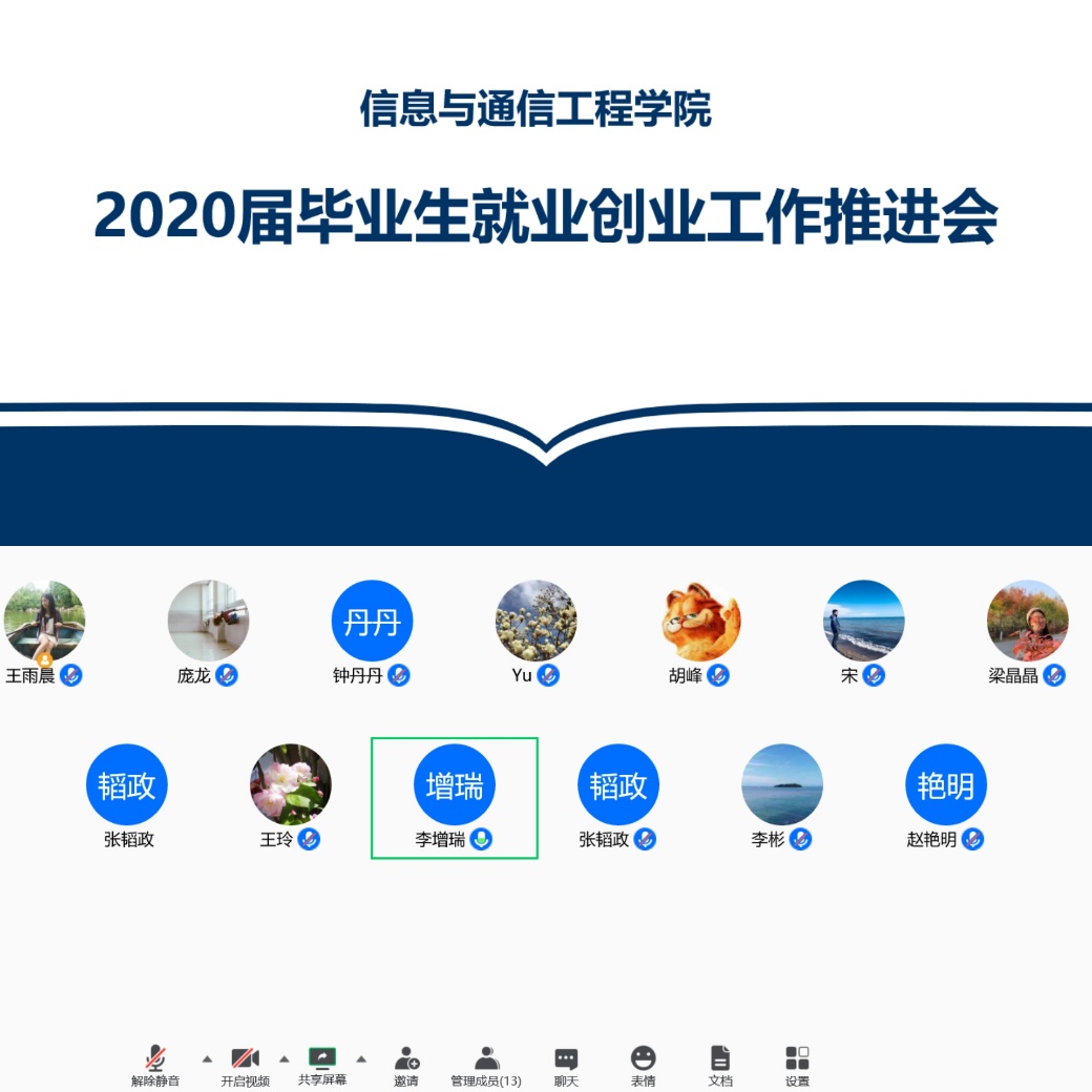 (通讯员 王雨晨)为贯彻教育部、学校关于在新冠肺炎疫情形势下就业创业工作精神,落实“全员抓就业”工作理念,推进学院就业创业工作稳步开展,信息与通信工程学院于5月15日下午组织召开2020届毕业生就业创业工作推进会议。学院2020届毕业生就业创业工作领导小组全体成员参加,会议由学院党委副书记钟丹丹主持。